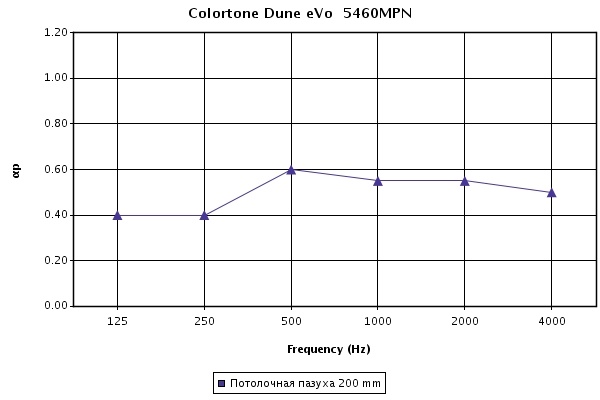 Рис.2 Зависимость коэффициента звукопоглощения (aP) от частоты (Гц) звука для цветных потолочных панелей Colortone Dune eVo Platinum