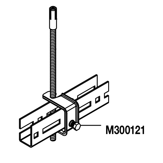 Зажимная скоба М300121 используется для подвешивания U-профиля к основанию потолка с помощью резьбового стержня (шпильки).